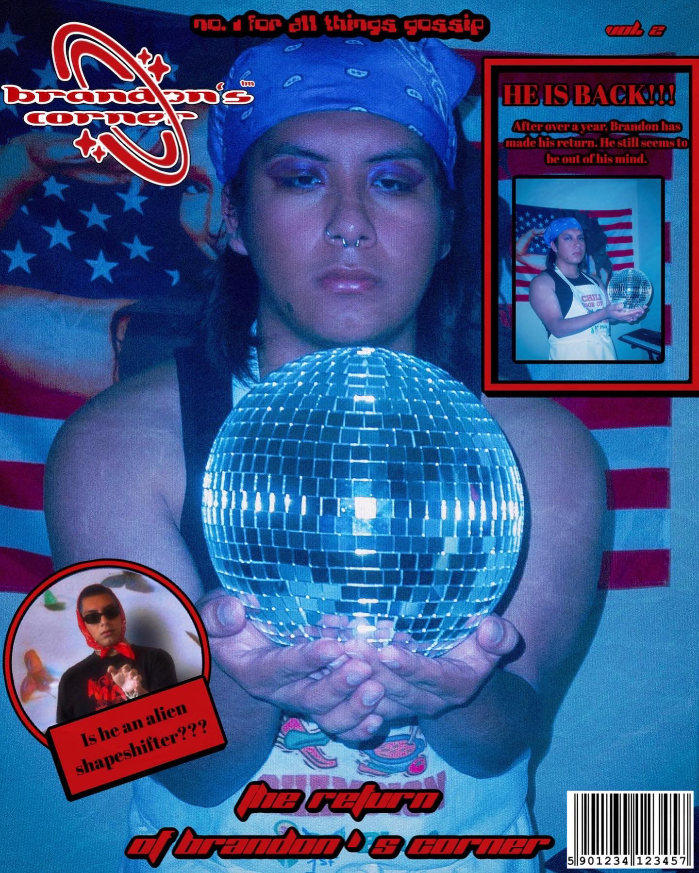 This piece is a satirical commentary on pop culture, celebrity, and consumerism that grips hard on American culture. I formatted this piece in the style of a gossip magazine because in America, it seems like a lot of the media is more involved in trying to sell the juiciest celebrity gossip rather than informing the public on what is actually happening around the globe. This is a part of a “series” I have created based around the concept of this gossip magazine called “brandon’s corner”. The purpose of this is to have the viewer analyze all the weird things in the image such as an American flag with a celebrity on it, a disco ball, and what I am wearing to then think of how absurd it all is.